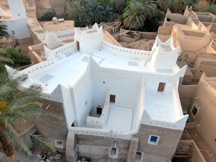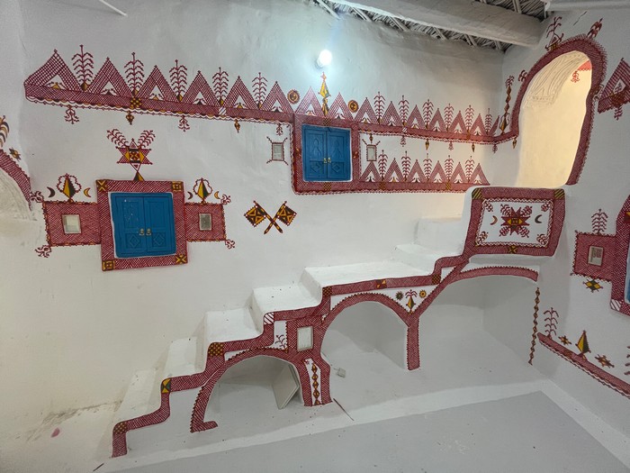 The restoration relied on traditional building techniques and locally sourced materials. These included palm trunks for structural support and architectural details, handmade mud bricks, natural lime wash, and “Zanjafour,” a decorative colourful mixture applied to interior walls. Women artisans played a key role in recreating the traditional wall paintings, using the same materials and methods passed down through generations.